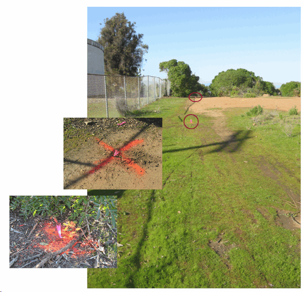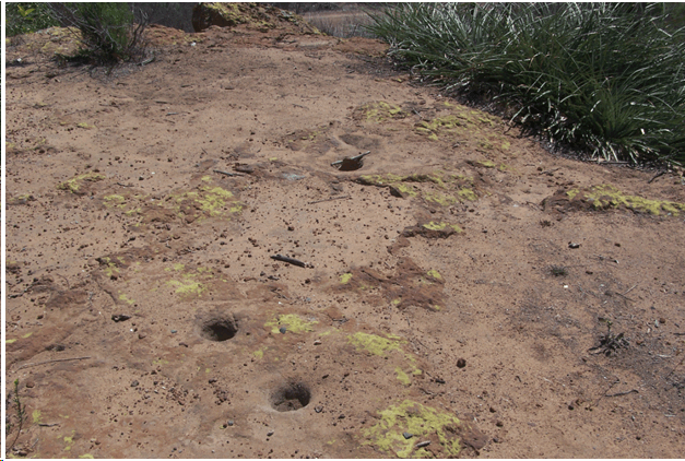 We’ve always assumed that any expansion of the cemetery would exclude disturbing the site except for careful cleanup and restoration.  Sadly, I noticed some markers indicating pipes will be laid down which pass right through the side bordering the water tower property.  We understood such lines would be routed around the ridge, not through it.  Please re-evaluate the placement of such lines so that they do not disturb this important historic resource.  It seems unnecessary to have to route any utilities through this site since it’s basically a sandstone ridge and will not be landscaped.  The site must be preserved, not disturbed.  Any restoration and cleanup must be carefully handled because artifacts and unique geologic features could be easily damaged, disturbed or removed by contractors with their trenching machines.  Just driving a tractor over this area could cause considerable damage to delicate artifacts and plant life.  Here’re a few photographs to help illustrate our concerns.