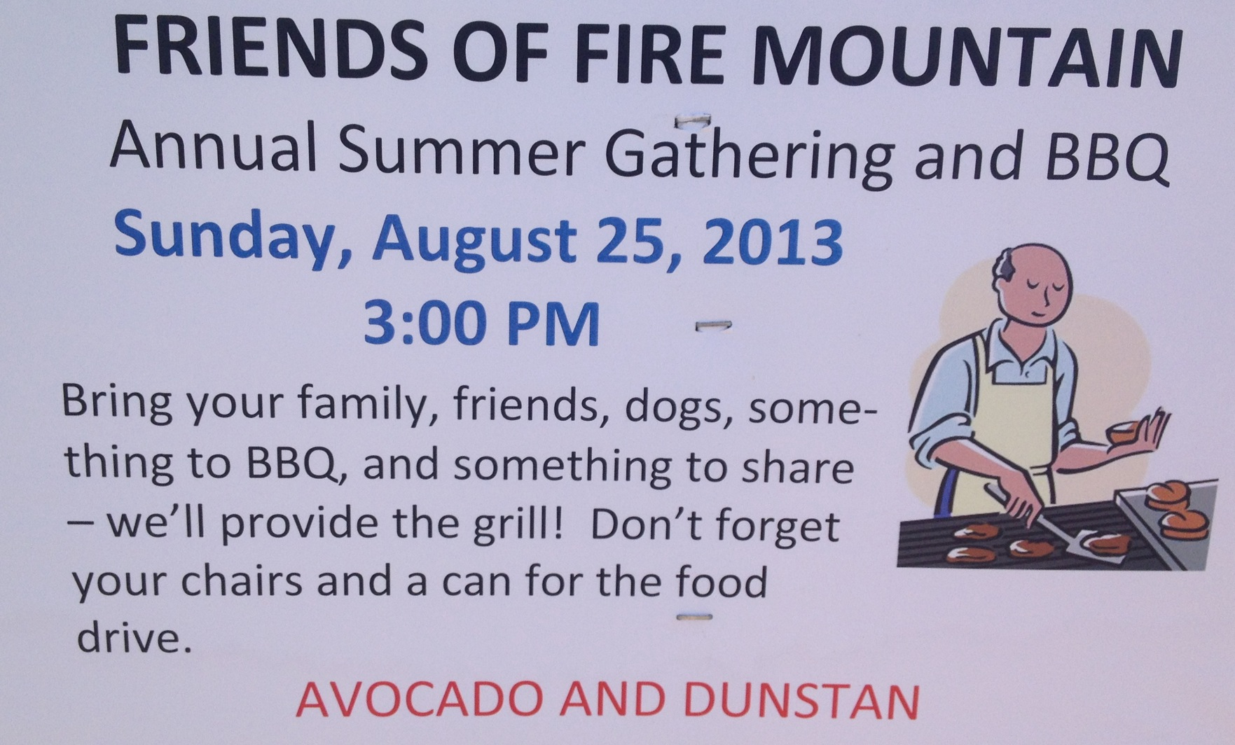 Friends and Families of Fire Mountain – join us for good times, beverages, and BBQ.